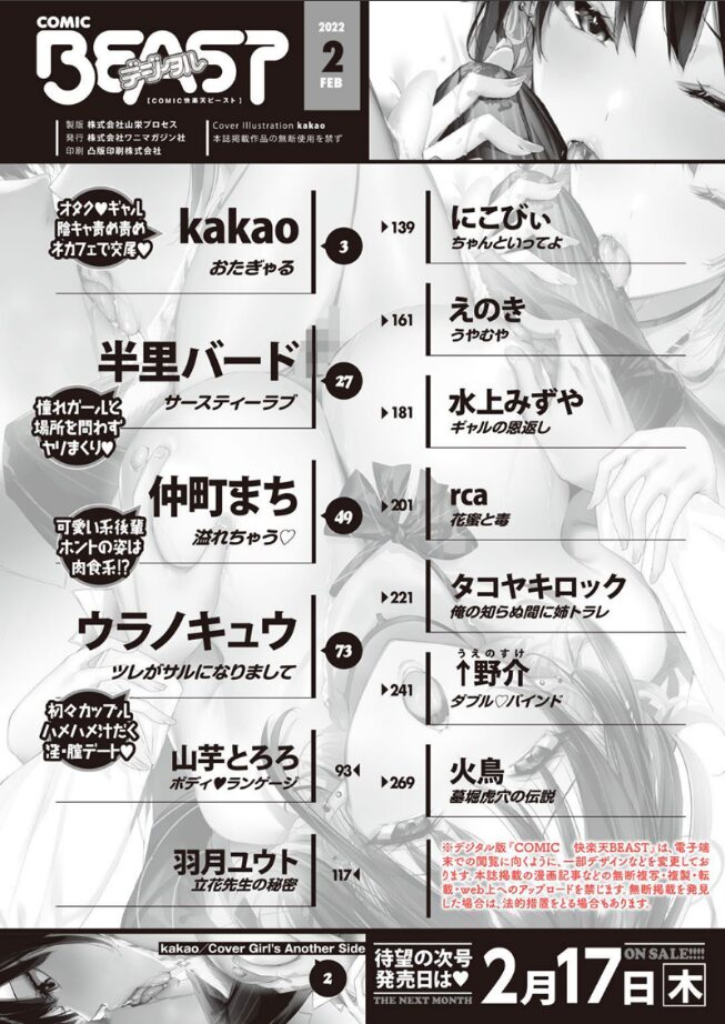 - 作者 : kakao 半里バード 仲町まち ウラノキュウ rca 火鳥 羽月ユウト にこびぃ 山芋とろろ えのき タコヤキロック 水上みずや ↑野介