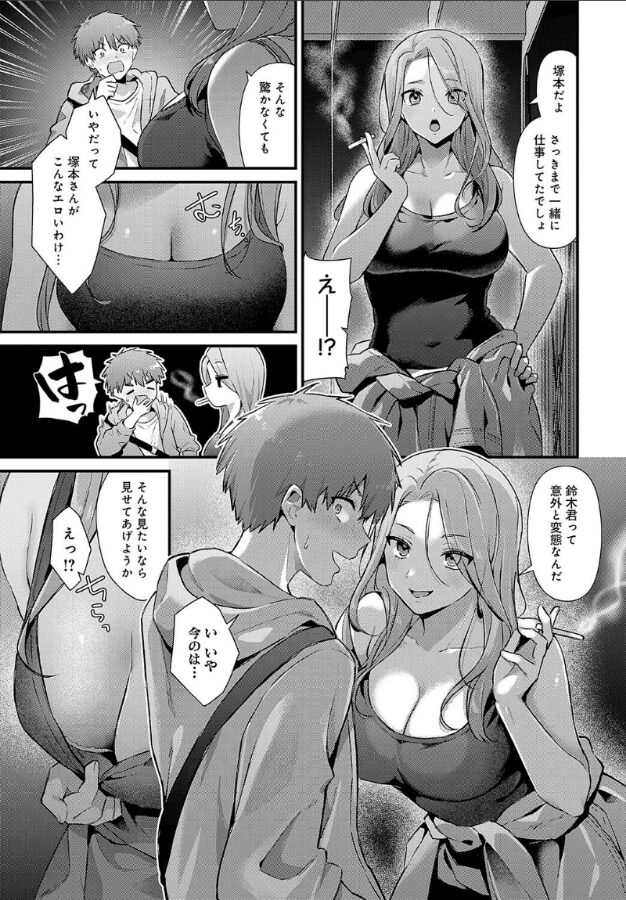 職場の先輩・塚本さんはミスばかりの俺に厳しい。今日も叱られて落ち込みながら喫煙所に向かうと、そこには刺激的なタンクトップ姿の超絶美女が。なんと、その美女の正体は、私服姿の塚本さんだった! 意外な一面に驚きつつも、俺の視線は胸元に集中してしまい–。 「そんな見たいなら見せてあげようか」積極的な塚本さんに流されるがまま、おっぱいを見たり触ったり。そしてそのままホテルへ–!? 会社では怖いのに、夜はドMでヤられたがりな塚本さん。情熱的で性欲旺盛な彼女となら、今夜はいくらでも楽しめそうな予感–!! 発情ヒロイン番長・餅田こゆび先生が贈る、厳しい先輩との性欲全開エッチ☆